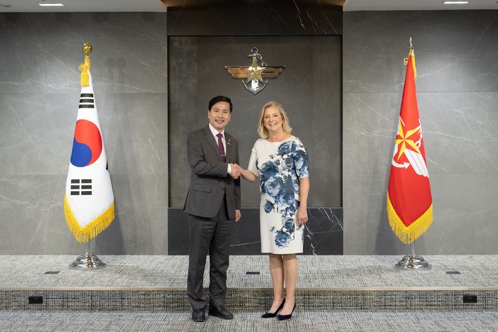 [서울=뉴시스] 김금보 기자 = 김선호 국방부 차관이 31일 오전 서울 용산구 국방부에서 크리스틴 워머스(Christine Wormuth) 미(美) 육군성 장관을 접견하고 기념 촬영하고 있다. 김 차관은 한반도 안보 정세와 한미동맹 발전 방안에 대해 논의했다. (사진=국방부 제공) 2024.07.31. [email protected] *재판매 및 DB 금지