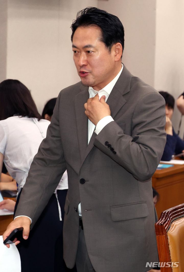 [서울=뉴시스] 조성봉 기자 = 장동혁 국민의힘 의원이 31일 오전 서울 여의도 국회에서 열린 법제사법위원회 전체회의에서 정청래 법사위원장의 의사진행과 더불어민주당 의원들의 발언에 항의하며 밖으로 나가고 있다. 2024.07.31. [email protected]