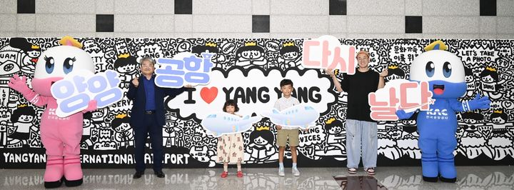 사진은 김동국 한국공항공사 양양공항장, 요요진 작가 등 드로잉 퍼포먼스 참여자들이 기념촬영을 하는 모습. (사진=한국공항공사 제공) 2024.07.31. [email protected]