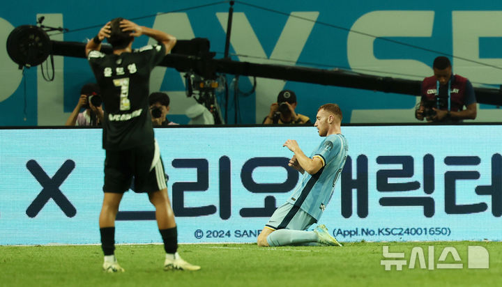 [서울=뉴시스] 홍효식 기자 = 31일 서울 마포구 서울월드컵경기장에서 열린 쿠팡플레이 시리즈 1차전 팀 K리그와 토트넘 홋스퍼의 경기, 토트넘 데얀 클루셉스키가 선제골을 넣고 세리머니하고 있다. 2024.07.31. [email protected]