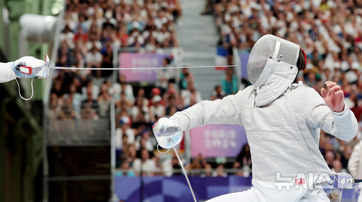 [파리=뉴시스] 김진아 기자 = 박상원이 31일(현지시각) 프랑스 파리 그랑 팔레에서 열린 2024 파리 올림픽 펜싱 남자 사브르 단체 8강 캐나다와의 경기에서 공격을 피하고 있다. 2024.07.31. [email protected]