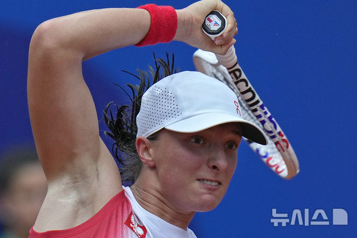 [파리=AP/뉴시스] 이가 시비옹테크(1위·폴란드)가 지난달 31일(현지시각) 프랑스 파리의 스타드 롤랑가로스에서 열린 2024 파리올림픽 테니스 여자 단식 8강전에서 대니얼 콜린스(9위·미국)와 경기하고 있다. 시비옹테크가 기권승(6-1 2-6 4-1)을 거두고 4강에 올랐다. 2024.08.01.