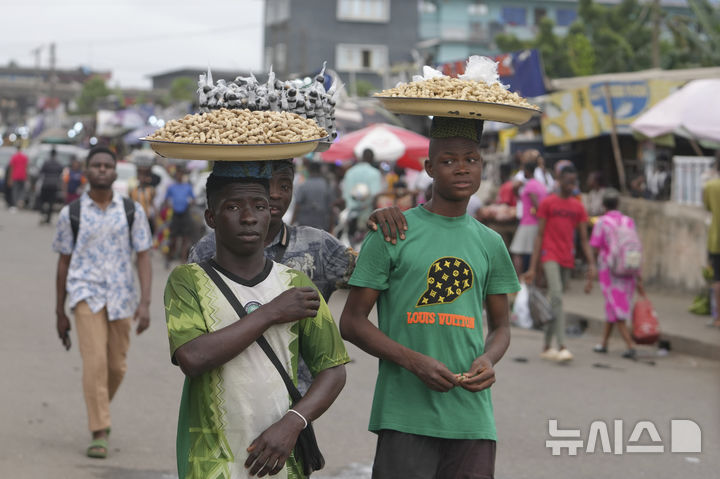 [라고스=AP/뉴시스] 지난달 31일(현지시각) 나이지리아 라고스 거리에서 청소년들이 땅콩을 팔고 있다. 날로 심해지는 경제난에 분노한 나이지리아 젊은이들은 8월 1일 전국적인 시위를 계획하고 있고 나이지리아 정부는 강경 대응을 예고했다. 2024.08.01.