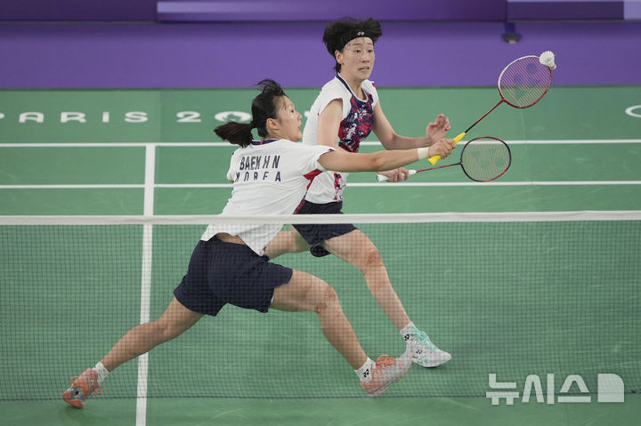 [파리=AP/뉴시스] 백하나-이소희 조(2위)가 1일(현지시각) 프랑스 파리의 포르트드 라샤펠 경기장에서 열린 2024 파리올림픽 배드민턴 여자복식 8강전에서 리우 셍수-탄닝 조(3위·중국)와 경기하고 있다. 백하나와 이소희가 0-2(9-21 13-21)로 패해 4강 진출이 무산됐다. 2024.08.01.