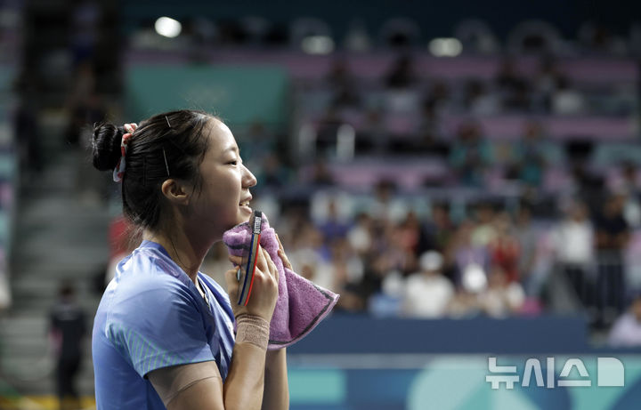 [파리=뉴시스] 최동준 기자 = 신유빈이 1일(현지시각) 프랑스 파리 사우스 파리 아레나5에서 열린 2024 파리 올림픽 탁구 여자 단식 8강전 일본 히라노 미우와의 경기에서 풀세트 접전 끝에 승리하며 준결승 진출을 확정한 뒤 기뻐하고 있다. 2024.08.01. [email protected]