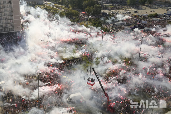 [바르샤바=AP/뉴시스] 1일(현지시각) 폴란드 바르샤바 시내에서 주민들이 '바르샤바 봉기' 80주년을 기념해 불꽃탄을 터트리고 있다. 1944년 8월 1일 시작한 바르샤바 봉기는 제2차 세계대전 중 나치 독일에 대항해 봉기한 저항운동으로 2차 대전 중 최대 규모의 단일 군사행동으로 알려져 있다. 2024.08.02.
