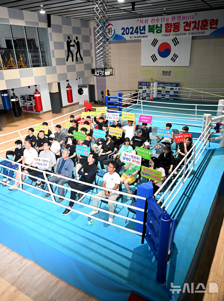 [화순=뉴시스] 김혜인 기자 = 임애지(화순군청)의 2024파리 올림픽 복싱 여자 54kg급 8강전 응원전이 열린 2일 오전 전남 화순군 하니움 복싱체육관에서 체육회 관계자들과 학생 선수들이 임애지의 득점에 환호하고 있다. 임애지는 한국 여자 복싱 사상 최초로 올림픽 메달을 거머쥐었다. 2024.08.02. [email protected]