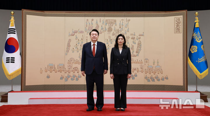 [서울=뉴시스] 최진석 기자 = 윤석열 대통령이 2일 서울 용산 대통령실 청사에서 열린 임명장 수여식에서 유혜미 대통령실 저출생대응수석에게 임명장을 수여 후 기념촬영을 하고 있다. (대통령실통신사진기자단) 2024.08.02. [email protected]