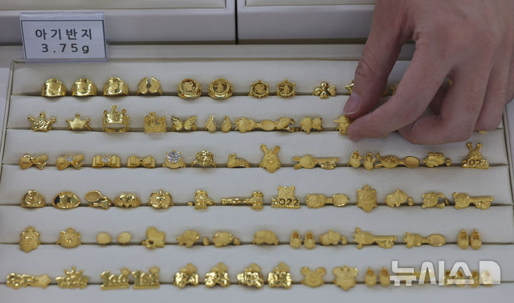 [서울=뉴시스] 김금보 기자 = 2일 서울 종로구 한국금거래소에서 직원이 금 반지 상품을 진열하고 있다. 대표적 안전자산으로 꼽히는 금 가격이 오르고 있다. 2일 표준금거래소에 따르면 전일 기준 금 한 돈(3.75g)을 살 때 가격은 45만4000원으로 전 거래일에 비해 3000원(0.67%) 상승했다. 2024.08.02. [email protected]