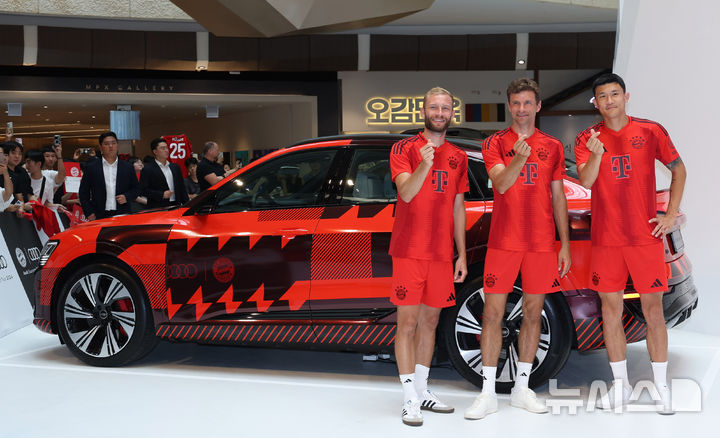 [서울=뉴시스] 김명년 기자 = 바이에른 뮌헨의 김민재(오른쪽 부터), 토마스 뮐러, 콘라트 라이머가 2일 오후 서울 영등포구 IFC몰에서 열린 아우디 써머투어 2024에서 '더 뉴 아우디 Q8 e-트론'을 공개하고 기념촬영을 하고 있다. 2024.08.02. [email protected]