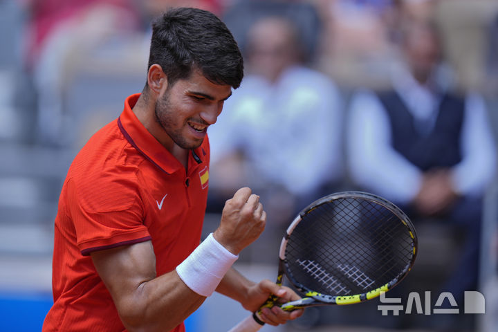 [파리=AP/뉴시스] 카를로스 알카라스(3위·스페인)가 2일(현지시각) 프랑스 파리의 스타드 롤랑가로스에서 열린 2024 파리올림픽 테니스 남자 단식 준결승에서 오제 알리아심(19위·캐나다)과 경기하고 있다. 알카라스가 2-0(6-1 6-1)으로 승리하고 결승에 올라 노바크 조코비치(2위·세르비아)와 금메달을 다툰다. 2024.08.03.