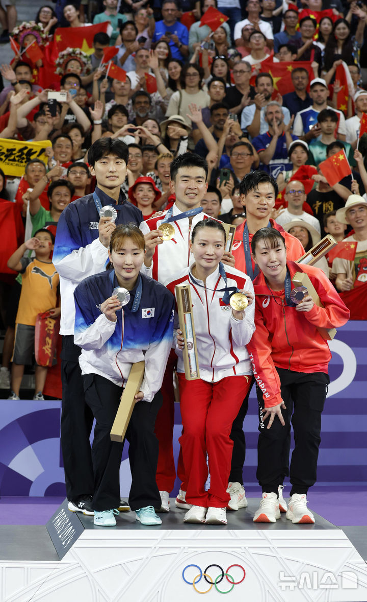 [파리=뉴시스] 최동준 기자 = 김원호와 정나은이 2일(현지시각) 프랑스 파리 아레나 포르트 드 라샤펠에서 열린 2024 파리 올림픽 배드민턴 혼합 복식 시상식에서 은메달을 목에 걸고 포즈를 취하고 있다. 2024.08.02. [email protected]