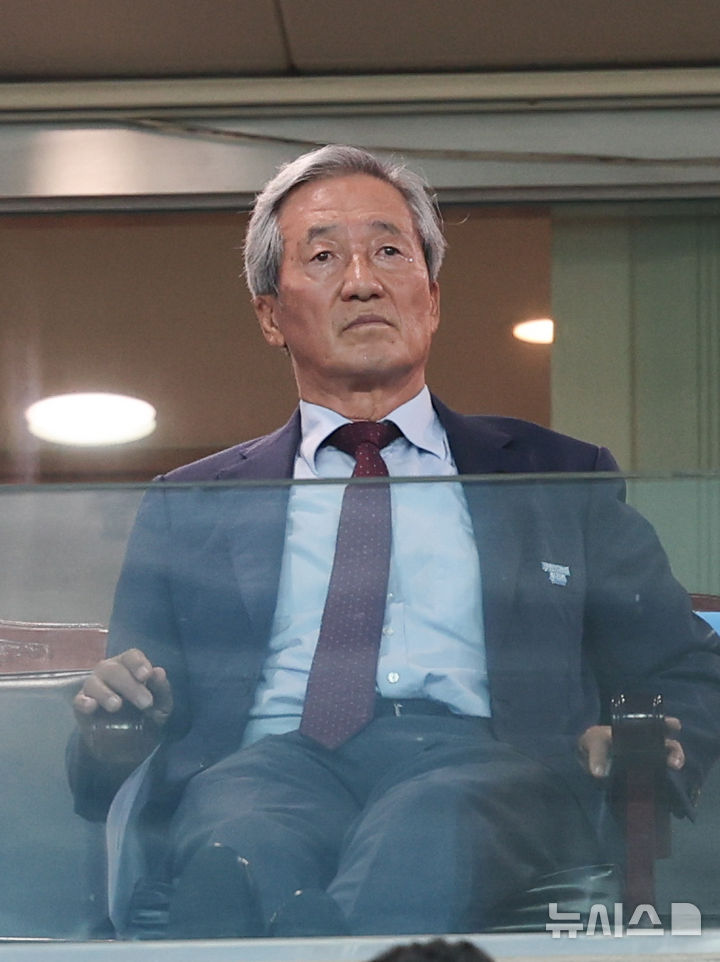 [서울=뉴시스] 김근수 기자 = 3일 서울 마포구 서울월드컵경기장에서 열린 쿠팡플레이 시리즈 2경기 토트넘 홋스퍼와 FC바이에른 뮌헨의 경기 시작 전 정몽준 전 대한축구협회장이 관중석에서 경기장으 바라보고 있다. 2024.08.03. [email protected]