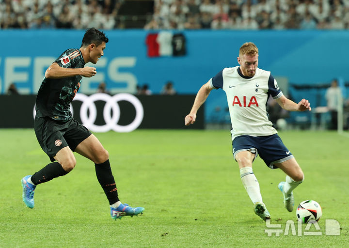 [서울=뉴시스] 김근수 기자 = 3일 서울 마포구 서울월드컵경기장에서 열린 쿠팡플레이 시리즈 2경기 토트넘 홋스퍼와 FC바이에른 뮌헨의 경기 전반에서 바이에른 뭰헨 김민재가 토트넘 쿨루셉스키를 막아내고 있다. 2024.08.03. [email protected]