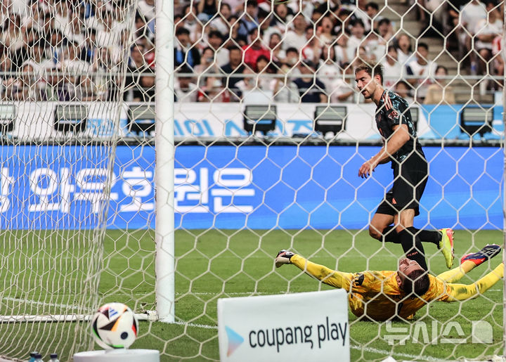 [서울=뉴시스] 김근수 기자 = 바에이른 뮌헨 레온 고레츠카가 3일 서울 마포구 서울월드컵경기장에서 열린 쿠팡플레이 시리즈 2경기 토트넘 홋스퍼와 FC바이에른 뮌헨의 경기 후반 추가골을 넣고 있다. 2024.08.03. [email protected]