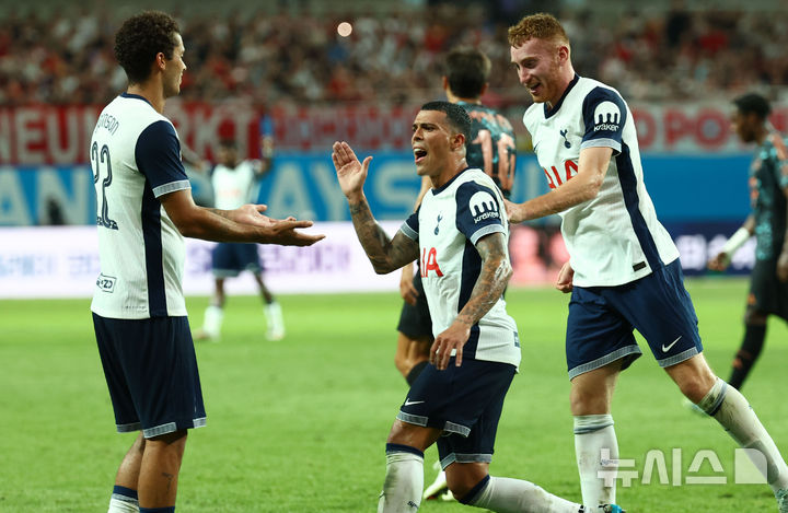 [서울=뉴시스] 황준선 기자 = 3일 오후 서울 마포구 서울월드컵경기장에서 열린 쿠팡플레이 시리즈 2경기 토트넘 홋스퍼와 FC바이에른 뮌헨의 경기, 후반 팀의 첫 골을 넣은 토트넘 페드로 포로가 존슨과 기쁨을 나누고 있다. 2024.08.03. [email protected]