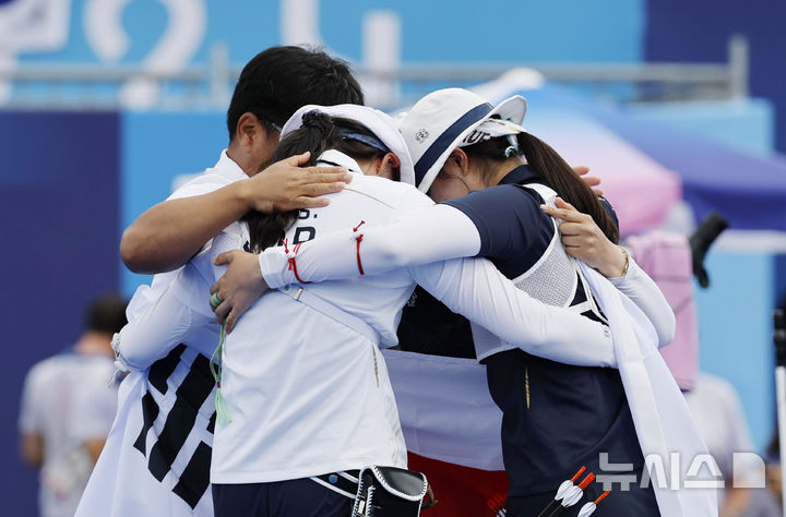 [파리=뉴시스] 최동준 기자 = 3일(현지시각) 프랑스 파리 레쟁발리드에서 열린 2024 파리 올림픽 양궁 개인전에서 금메달을 획득한 임시현과 은메달을 획득한 남수현이 서로를 격려하고 있다. 2024.08.03. [email protected]