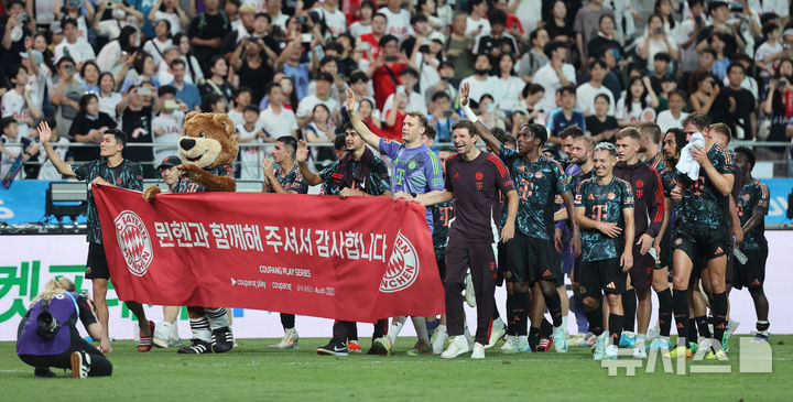 [서울=뉴시스] 김근수 기자 = 3일 서울 마포구 서울월드컵경기장에서 열린 쿠팡플레이 시리즈 2경기 토트넘 홋스퍼와 FC바이에른 뮌헨의 경기에서 FC바이에른 뮌헨이 토트넘 홋스퍼를 상대로 2-1로 승리를 거뒀다. FC바이에른 뮌헨 선수들이 경기장을 돌며 팬들에게 인사를 하고 있다. 2024.08.03. [email protected]