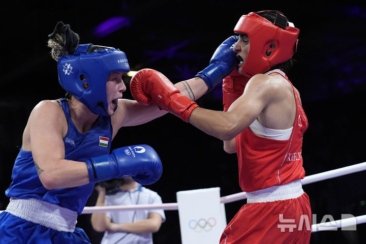[파리=AP/뉴시스] 성별 논란이 일었던 이만 켈리프(알제리, 오른쪽)가 3일(현지시각) 프랑스 파리의 노스 아레나에서 열린 2024 파리올림픽 복싱 여자 66㎏급 8강전에서 안나 루카 하모리(헝가리)와 경기하고 있다. 심판 만장일치로 준결승에 올라 동메달을 확보한 켈리프는 재엠 수완나펭(태국)과 결승 진출을 다툰다. 2024.08.04.