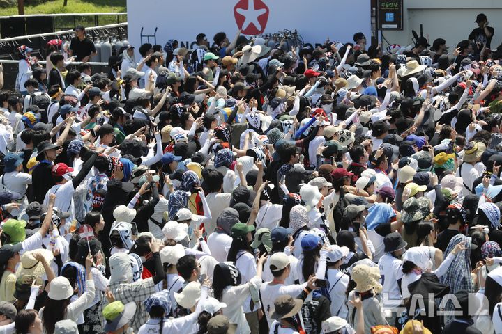 [인천=뉴시스] 김동영 기자 = 폭염 경보가 발효된 4일 오후 인천 연수구 송도달빛축제공원에서 열린 '2024 인천펜타포트 락 페스티벌'에서 관람객들이 공연을 즐기고 있다. 2024.08.04. [email protected]