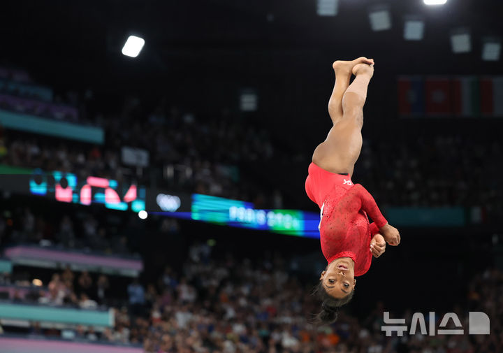 [파리=뉴시스] 김진아 기자 = 미국 시몬 바일스가 3일(현지시각) 프랑스 파리 베르시 경기장에서 열린 2024 파리 올림픽 기계체조 여자 도마 결승전에서 연기를 펼치고 있다. 2024.08.04. [email protected]