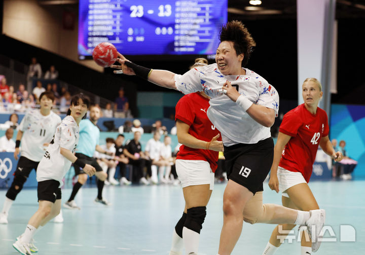 [파리=뉴시스] 최동준 기자 = 3일(현지시각) 프랑스 파리 사우스 파리 아레나6에서 열린 2024 파리 올림픽 여자 핸드볼 조별리그 A조 한국과 덴마크의 경기에서 강은혜가 슛을 시도하고 있다. 2024.08.04. [email protected]