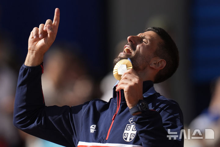 [파리=AP/뉴시스] 노바크 조코비치(2위·세르비아)가 4일(현지시각) 프랑스 파리의 스타드 롤랑가로스에서 열린 2024 파리올림픽 테니스 남자 단식 정상에 올라 금메달을 들고 환호하고 있다. 조코비치는 결승전에서 카를로스 알카라스(3위·스페인)를 2-0(7-6<7-3> 7-6<7-2>)으로 꺾고 금메달을 따며 마침내 '골든 그랜드슬램'을 완성했다. 2024.08.05.