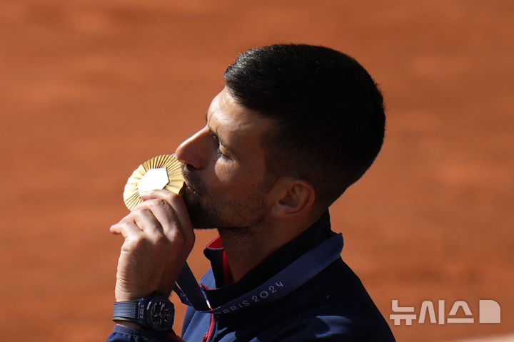[파리=AP/뉴시스] 노바크 조코비치(2위·세르비아)가 4일(현지시각) 프랑스 파리의 스타드 롤랑가로스에서 열린 2024 파리올림픽 테니스 남자 단식 정상에 올라 금메달을 들고 입 맞추고 있다. 조코비치는 결승전에서 카를로스 알카라스(3위·스페인)를 2-0(7-6<7-3> 7-6<7-2>)으로 꺾고 금메달을 따며 마침내 '골든 그랜드슬램'을 완성했다. 2024.08.05.