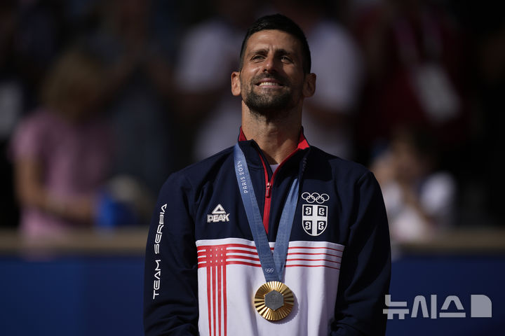 [파리=AP/뉴시스] 노바크 조코비치(2위·세르비아)가 4일(현지시각) 프랑스 파리의 스타드 롤랑가로스에서 열린 2024 파리올림픽 테니스 남자 단식 정상에 올라 금메달을 걸고 시상대에 올라 포즈를 취하고 있다. 조코비치는 결승전에서 카를로스 알카라스(3위·스페인)를 2-0(7-6<7-3> 7-6<7-2>)으로 꺾고 금메달을 따며 마침내 '골든 그랜드슬램'을 완성했다. 2024.08.05.