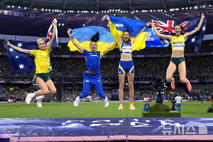 [파리=AP/뉴시스] 야로슬라바 마후치크(오른쪽 두 번째)와 이리나 게라시첸코(왼쪽 두 번째, 이상 우크라이나)가 4일(현지시각) 프랑스 파리 스타드 드 프랑스에서 열린 2024 파리올림픽 육상 여자 높이뛰기에서 각각 금메달과 동메달을 딴 후 국기를 들고 시상대에서 점프 샷을 찍고 있다. 마후치크는 2m00을 뛰어넘어 우크라이나 선수로는 처음으로 이 종목 금메달의 주인공이 되면서 조국에 두 번째 금메달을 안겼다. 은메달은 니컬라 올리슬라저스, 또 하나의 동메달은 엘리너 패터슨(이상 호주)이 차지했다. 2024.08.05.