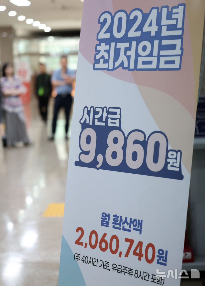[서울=뉴시스] 이영환 기자 = 5일 오후 서울 마포구 서울서부고용복지플러스센터에 최저임금 안내 홍보물이 게시되어 있다.