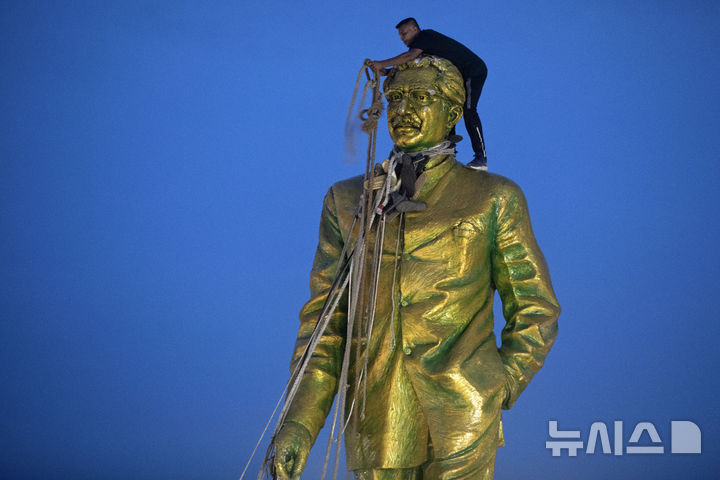 [다카=AP/뉴시스] 5일(현지시각) 방글라데시 다카에서 한 남성이 셰이크 하시나 총리의 부친인 셰이크 무지부르 라만의 조각상에 밧줄을 묶기 위해 올라가고 있다. 하시나 총리가 총리직에서 물러나자, 시위대는 방글라데시 초대 대통령이자 '건국의 아버지'라고 불리는 라만의 조각상 철거를 시도하고 있다. 2024.08.06.