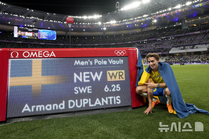 [파리=AP/뉴시스] 아르망 뒤플랑티스(스웨덴)가 5일(현지시각) 프랑스 파리의 스타드 드 프랑스에서 열린 2024 파리올림픽 남자 장대높이뛰기 결선에서 세계 신기록을 경신한 후 기념 촬영을 하고 있다. 뒤플랑티스는 6m25를 넘어 본인의 기록인 6m24를 깨고 세계 신기록을 세우며 금메달을 목에 걸었다. 올림픽 2연패. 2024.08.06.