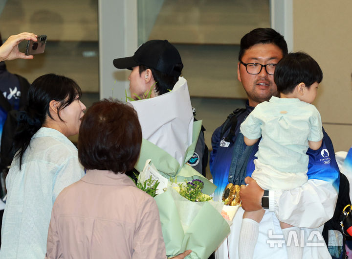 [인천공항=뉴시스] 고범준 기자 = 2024 파리 올림픽 양궁 전 종목에서 금메달을 획득한 대한민국 양궁 대표팀 김우진이 6일 오전 인천국제공항 제2여객터미널을 통해 귀국해 가족들과 함께 대화를 나누고 있다. 2024.08.06. [email protected]