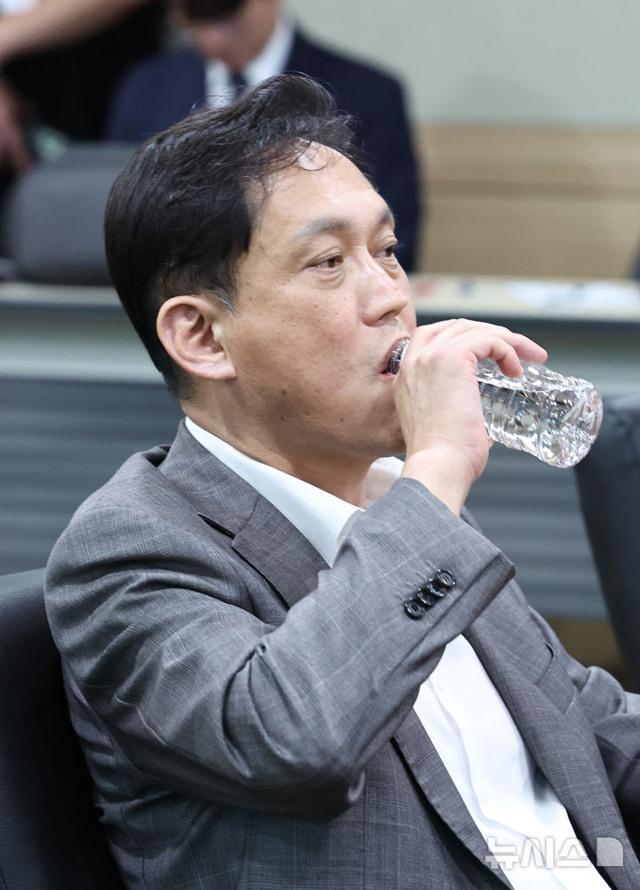 [과천=뉴시스] 김금보 기자 = 김태규 방송통신위원회 위원장 직무대행이 6일 오후 경기도 과천시 정부과천청사 방송통신위원회에서 열린 더불어민주당 소속 과학기술정보방송통신위원회 위원들의 'KBS 이사 및 방문진 이사 선임 과정 불법성 검증'에서 물을 마시고 있다. 2024.08.06. [email protected]