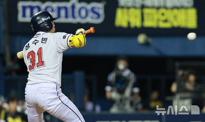 [서울=뉴시스] 고범준 기자 = 7일 오후 서울 송파구 잠실야구장에서 열린 2024 KBO리그 두산 베어스와 LG 트윈스의 경기, 7회말 무사 1,2루 두산 정수빈이 투수가 던진 공을 피하고 있다. 2024.08.07. [email protected]