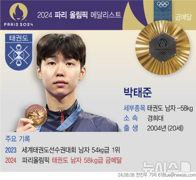 [서울=뉴시스] 태권도 국가대표 박태준이 8일(한국시각) 파리 올림픽 태권도 남자 58㎏급 결승에서 금메달을 목에 걸었다. 한국 남자 태권도 16년 만의 금메달이다. (그래픽=전진우 기자)