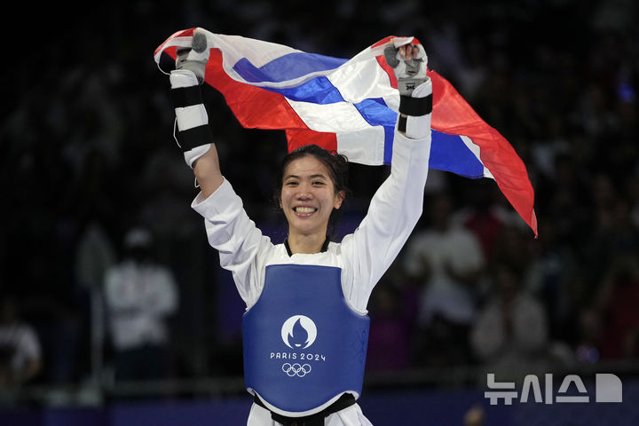 [파리=AP/뉴시스] 파니팍 웡파타나낏(태국)이 7일(현지시각) 프랑스 파리의 그랑 팔레에서 열린 2024 파리올림픽 태권도 여자 49㎏급 정상에 올라 국기를 흔들며 세리머니하고 있다. 이번 올림픽을 끝으로 은퇴를 밝힌 웡파타나낏은 결승에서 궈칭(중국)을 2-1로 꺾고 우승, 태국 올림픽 사상 처음으로 종목 2연패를 달성했다. 2024.08.08.