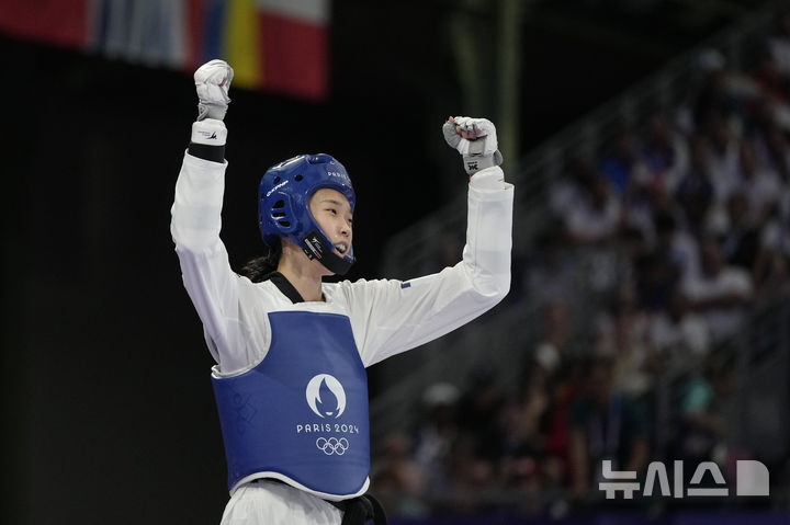 [파리=AP/뉴시스] 김유진이 8일(현지시각) 프랑스 파리의 그랑 팔레에서 열린 2024 파리올림픽 태권도 여자 57㎏급 4강전에서 뤄쭝스(중국)를 물리친 후 기뻐하고 있다. 김유진이 2-1(7-0 1-7 10-3)로 승리하고 결승에 진출했다 2024.08.09.