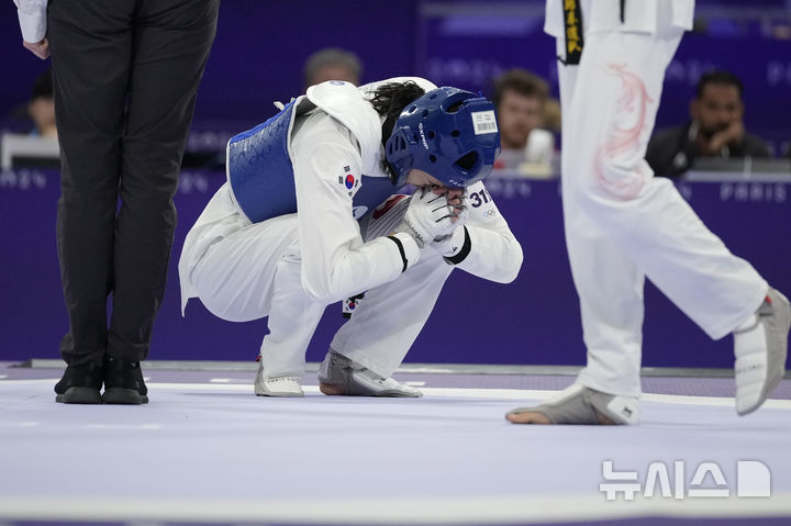 [파리=AP/뉴시스] 김유진이 8일(현지시각) 프랑스 파리의 그랑 팔레에서 열린 2024 파리올림픽 태권도 여자 57㎏급 4강전에서 뤄쭝스(중국)를 물리친 후 기뻐하고 있다. 김유진이 2-1(7-0 1-7 10-3)로 승리하고 결승에 진출했다 2024.08.09.