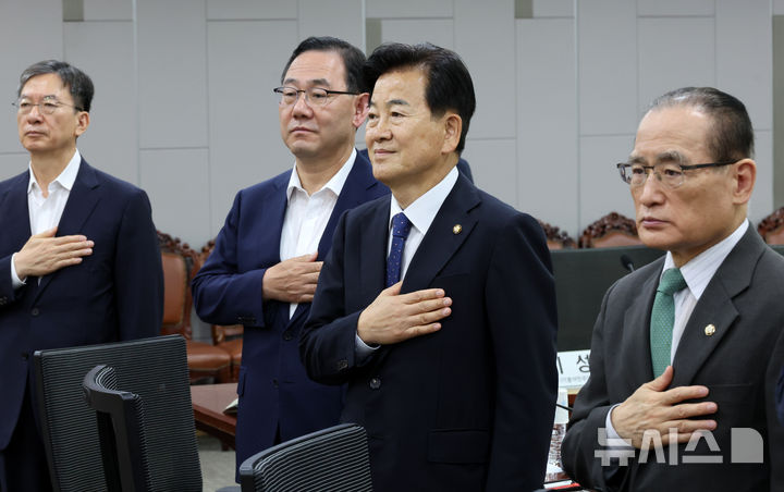 [서울=뉴시스] 조성우 기자 = 정동영(오른쪽 두 번째부터) 더불어민주당 의원, 주호영 국민의힘 의원 등이 8일 오전 서울 여의도 국회 의원회관에서 열린 동북아평화공존포럼 창립총회 및 한반도 평화를 위한 4자 회담 모색 토론회에서 국기에 대한 경례를 하고 있다. 2024.08.08. [email protected]