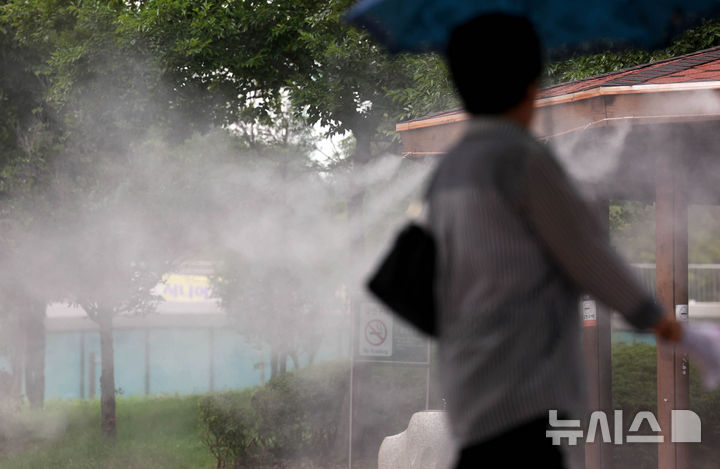 [광주=뉴시스] 광주지역에 폭염특보가 20일째 이어지고 있는 8일 광주 북구 우산근린공원 내 정자에 설치된 쿨링포그(안개형 냉각수) 아래로 시민들이 지나가고 있다. (사진 = 광주 북구 제공) 2024.08.08. [email protected]