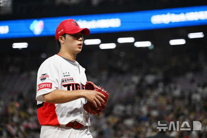 [광주=뉴시스] 이영주 기자 = 8일 오후 광주 북구 광주-기아챔피언스필드에서 열린 2024 신한 SOL뱅크 KBO리그 KIA 타이거즈 대 kt wiz의 경기, 6회 초 KIA 선발 황동하가 이닝을 마치고 덕아웃으로 들어오고 있다. 황동하는 6이닝 동안 공 89개를 던지고 삼진 9개를 기록했다. 2024.08.08. [email protected]