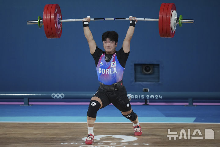 [파리=AP/뉴시스] 박주효가 8일(현지시각) 프랑스 파리 사우스 파리 아레나6에서 열린 2024 파리올림픽 역도 남자 73㎏급 용상 경기를 펼치고 있다. 박주효는 인상 147㎏, 용상 187㎏, 합계 334㎏을 들어 전체 12명 중 7위를 기록했다. 그는 용상 3차 시기에 시도한 196㎏을 들어 올리지 못하자 아쉬움에 눈물을 흘리기도 했다. 2024.08.09.