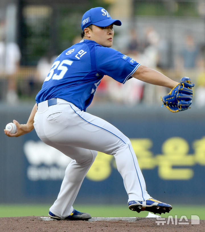 [광주=뉴시스] 류형근 기자 = 9일 오후 광주 북구 광주-기아챔피언스필드에서 열린 프로야구 KIA 타이거즈 대 삼성 라이온즈의 경기, 1회말 무사에서 삼성 선발투수 이승민이 역투를 하고 있다. 2024.08.09. [email protected]