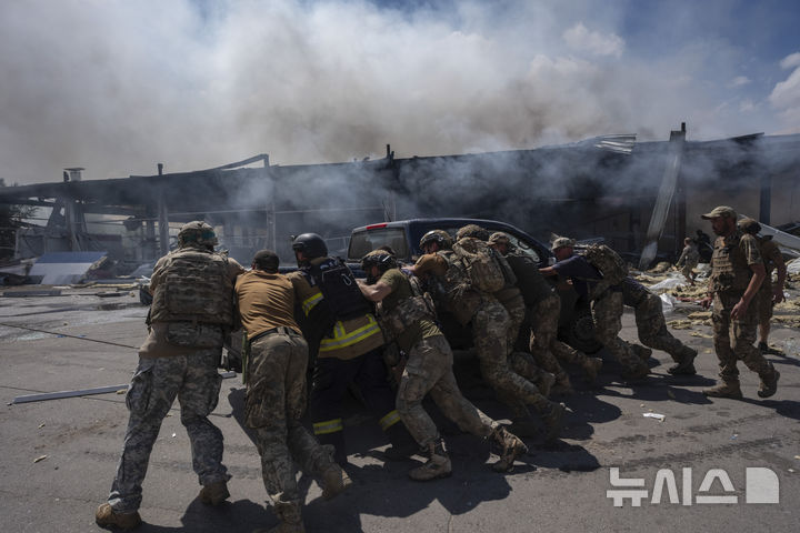 [코스탼티니우카=AP/뉴시스] 9일(현지시각) 우크라이나 도네츠크주 코스탼티니우카의 슈퍼마켓이 러시아의 미사일 공습을 받은 후 응급 구조대원과 군인들이 파손된 차량을 치우는 등 현장을 수습하고 있다. 현지 당국은 이 공격으로 최소 4명이 숨지고 24명이 다쳤다고 밝혔다. 2024.08.10.