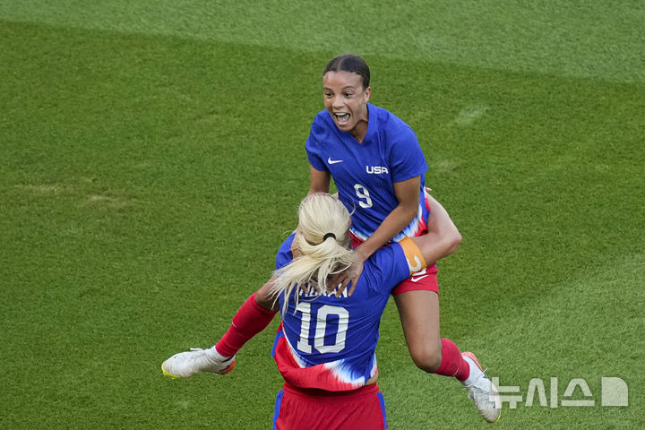 [파리=AP/뉴시스] 미국의 맬러리 스완슨이 10일(현지시각) 프랑스 파리의 파르크 데 프랭스에서 열린 2024 파리올림픽 여자 축구 결승전 브라질과 경기 후반 12분 선제 결승 골을 넣고 환호하고 있다. 미국이 결승전에서 브라질을 1-0으로 꺾고 12년 만에 금메달을 따냈다. 2024.08.11.