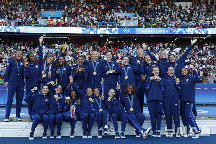 [파리=AP/뉴시스] 미국 선수들이 10일(현지시각) 프랑스 파리의 파르크 데 프랭스에서 열린 2024 파리올림픽 여자 축구 정상에 올라 금메달을 목에 걸고 기념 촬영을 하고 있다. 미국이 결승전에서 브라질을 1-0으로 꺾고 12년 만에 금메달을 획득했다. 2024.08.11.