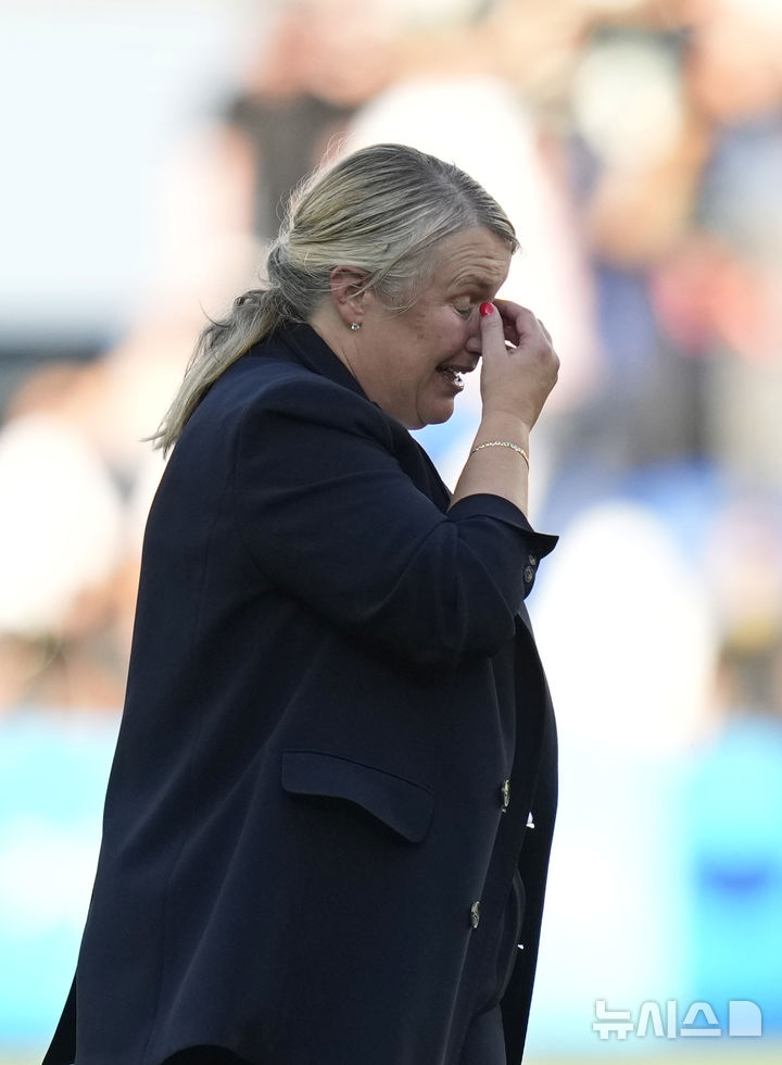 [파리=AP/뉴시스] 에마 헤이스 미국 여자축구 대표팀 감독이 10일(현지시각) 프랑스 파리의 파르크 데 프랭스에서 열린 2024 파리올림픽 여자 축구 결승전에서 브라질을 1-0으로 꺾고 우승한 후 기쁨의 눈물을 흘리고 있다. 올해 5월 미국 대표팀 지휘봉을 잡은 헤이스(영국) 감독은 불과 3개월 만에 올림픽에서 우승하는 기염을 토했다. 2024.08.11.
