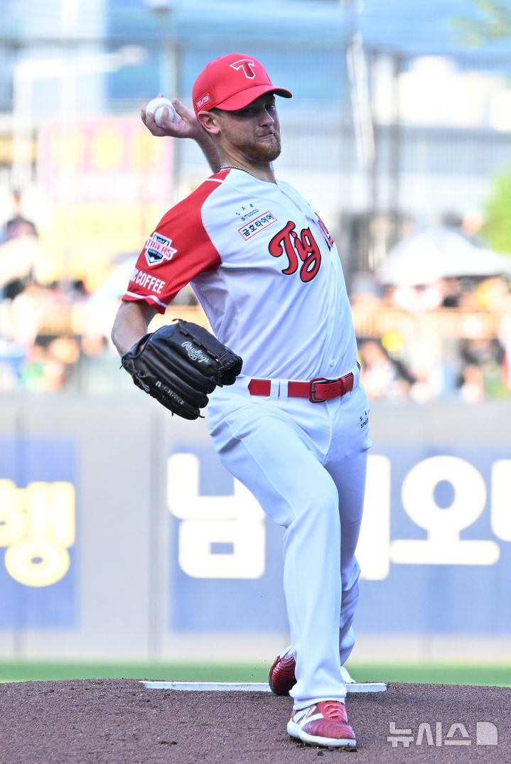 [광주=뉴시스] 변재훈 기자 = 11일 오후 광주 북구 광주-기아챔피언스필드에서 열린 프로야구 KIA 타이거즈 대 삼성 라이온즈의 경기, 1회초 KIA 새 외국인 선발투수 라우어가 역투를 하고 있다. 2024.08.11. [email protected]